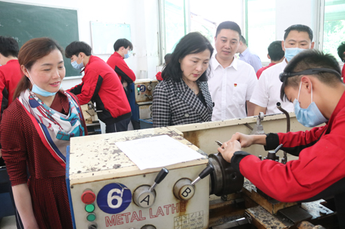 之后,夏玲又带队前往云吟职中老校区,参观了校园文化、师生作品展、学生宿舍和特色社团活动,并走进数控、旅游、汽修等实训室,深入了解云吟职中理实一体化实训课教学情况,对学校在内涵发展、专业建设、内务管理和特色社团方面给予好评。