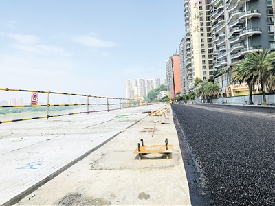 昨(9)日,记者在中心城区滨河路防洪能力提升综合整治工程(乐山大件码头至乐山沫若广场)施工现场看到,宽敞的滨河路(锦江嘉州宾馆至水岸名邸小区路段)上,一辆辆货车来到穿梭,将沥青混凝土倾倒在路面上,施工人员拿起铲子赶紧上前铺开,几台压路机紧随其后,来回碾压路面。