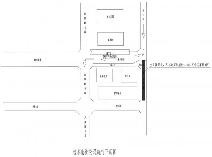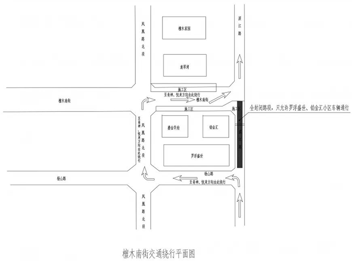 已建成的檀木南街全段半封闭施工,长约800米。沿途各主要路口保留双向通行,沿线小区保留一个出入口通行。封闭时间为2020年12月24日0:00至2021年2月8日24:00。