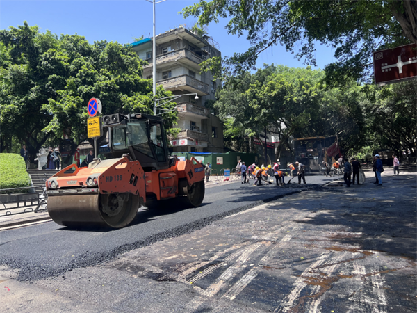 20日中午,叮咚街项目二期已经完成路面结构层的封闭,该段道路两侧人行道旁的围挡已经在进行拆除。在工程车、摊铺机、压路机等大型机械和工人的密切配合下,叮咚街项目二期进城方向的右半幅道路正在进行沥青混凝土底层铺设,刚刚铺完的路面上热气腾腾。