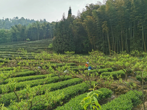 连日的晴朗天气,山野一片绿意盈盈,菜花依然在开,茶林处处吐翠,三月的炮房村在春日阳光的普照下,充满生机与活力。