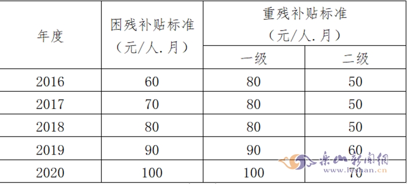 困残补贴是从2016年开始的,重残补贴是从2013年开始的,历年逐步提高标准,如下表格。
