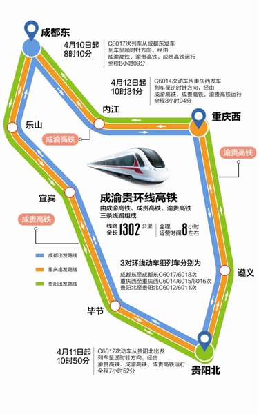 4月10日起,连通四川、贵州、重庆城市群的国内首条跨省环线高铁正式开行,首次在成都、重庆、贵阳三地开行环线动车组列车。届时,8个小时即可走完川渝贵三省,成渝贵环形圈将正式形成。西南交通大学经济管理学院教授李杰认为,未来,三城连通后将成为带动整个区域经济发展的重要支点,打开新一轮区域经济“红利期”。