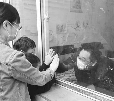 与妻子、儿子隔着玻璃击掌 图片由受访者提供