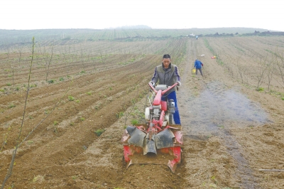 桃花看完,记者又来到村里的农业科技示范基地,只见一排排田地铺满山坡,道路穿插田地间,四通八达。李树园区内,李树开花较晚,纤细的树枝上,一串串比米粒还小的花苞正在发育,等待绽放。不远处,蔬菜种植区一派繁忙。农业机械的轰鸣声下,十多名工人分散在各处忙着春耕,为即将到来的萝卜播种做着准备。