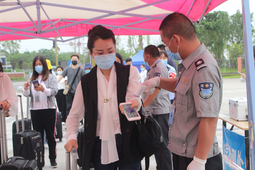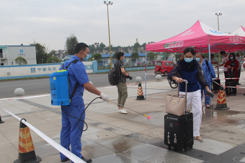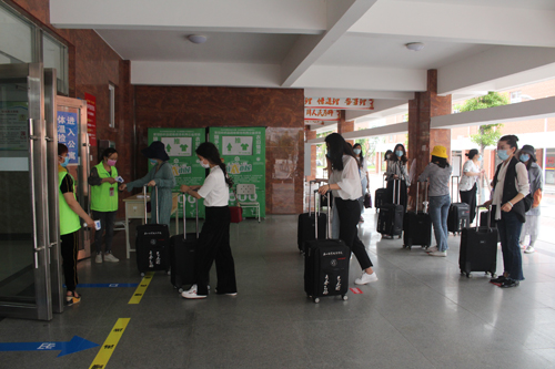 下午4点10分,演练正式开始,30名“返校学生”佩戴口罩,携带行李,按照校门标识标牌有序排队(间隔1米)进入,按照“一测二核三消毒四通过”的报到原则,进行体温检测、核验健康码、核实学生证和行李消毒后通过。
