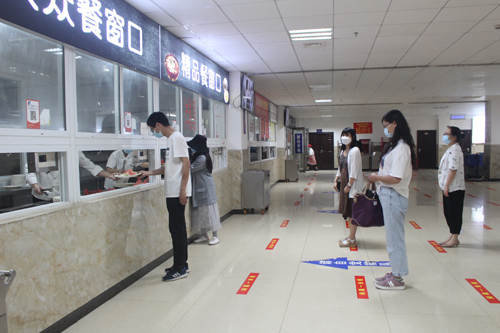 排队领餐演练中,“学生们”在进入教学场所、图书馆、食堂、宿舍等校内场所时,均全程佩戴口罩,按地面标识排队间隔一米,测量体温后进入,并间隔一定距离入座。就餐时,由志愿者引导学生洗手后再进入打餐窗口前通道。如果“学生”出现体温异常,将被送至卫生所进行评估,根据情况启动预案,实行隔离观察或送至指定医院进一步检查和治疗。