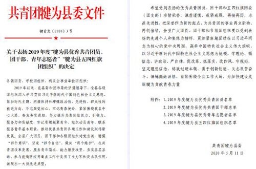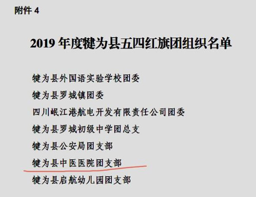 四川新闻网乐山5月13日讯(陈静)在纪念五四运动101周年、建团98周年之际,喜讯传来,根据共青团犍为县委《关于表扬2019年度“犍为县优秀共青团员、团干部、青年志愿者”“犍为县五四红旗团组织”》的决定(犍青发〔2020〕3号)获悉,犍为县中医医院团支部荣获“犍为县五四红旗团支部”荣誉称号。