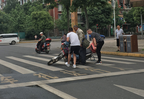 在路过康桥水郡红绿灯处,“哐”的一声巨响,一位正在骑摩托车的中年男子突然倒在了斑马线上,当时该男子趴在地上没有动弹。坐在车后排的赵小平,立马打开车门,一个健步冲过去,和另一位赶来帮忙的年轻小伙合力把摩托车扶了起来。