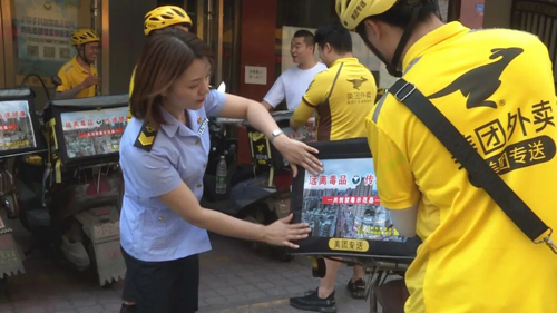 活动中,工作人员通过以案说法、介绍常见毒品等方式向外卖从业人员宣传毒品的种类及危害;并发放禁毒宣传手册,提高从业人员的拒毒、防毒意识;在送餐箱上贴上禁毒宣传语,通过骑手将禁毒宣传单随餐配送给广大人民群众。