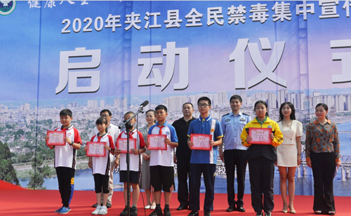 四川新闻网乐山6月10日讯(王伟 杨涛)为进一步营造禁毒舆论氛围、增强全民禁毒意识、提升社会各界对青少年禁毒宣传教育工作的重视,带动全县广大师生、各级各界积极参与禁毒行动,共创“禁毒示范县”,按照上级的统一部署,6月9日上午,夹江县禁毒委员会在夹江中学隆重举行“健康人生·绿色无毒”2020年全民禁毒集中宣传月活动启动仪式。