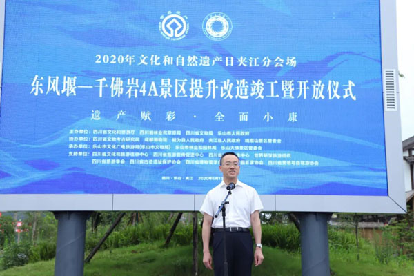 四川新闻网乐山6月14日(杨涛 文/图)“遗产赋彩,全面小康”,6月13日,2020年文化和自然遗产日四川主会场在乐山市举行。在夹江分会场,“东风堰—千佛岩4A景区”提升改造竣工暨开放仪式在四川夹江县禅意小镇如期举行。恢复开放后,“东风堰—千佛岩4A景区”将以新风貌喜迎游客,全面展示夹江县“百年古堰、千年古佛”的独特魅力和深厚文化底蕴。开放仪式上,乐山市人民政府副市长周伦斌宣布东风堰—千佛岩景区改造提升完成,正式面向社会开放。