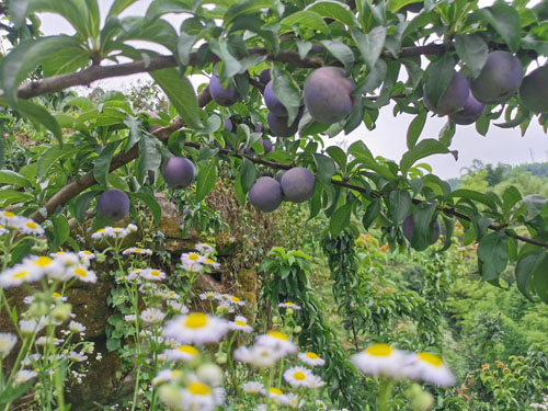 尹久村地形以坡地为主,气候、土壤、光照特别适宜发展李子产业。每年6月至9月,从山脚到山顶,满山遍野的李子树上硕果累累。漫步林中,红彤彤的李子让人垂涎欲滴。