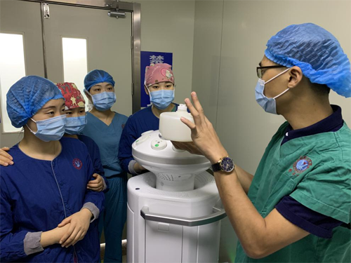 作为医院的外科枢纽,麻醉手术室处于密闭工作环境,急诊急救手术多,如遇新冠疑似、确诊病人,则面临术后消毒范围广、时间长、强度大,医护人员穿着防护服做了手术还要做一系列的清洁消毒工作,势必难度大,体能难以支撑,感染风险高。为减轻医护人员的工作量,解决新冠肺炎感染问题,乐山市人民医院为麻醉手术室购买了TMiRob智能消毒机器人和物流机器人。