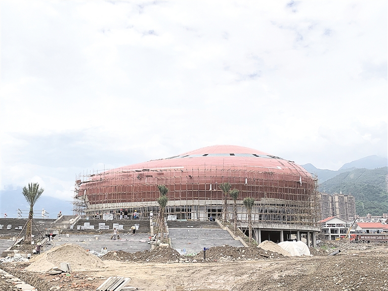 记者看到,沫若剧院、戏剧主题街区等主体建筑已全部完工,正进入内外装饰阶段。该项目负责人吴超介绍道:“目前室外总平与管网已完工,正在进行道路、停车场、广场找平和绿化堆坡造型施工。由于方案再次优化,整个工程将延期至7月15日完工,目前工人正加班加点高效推进项目建设。”