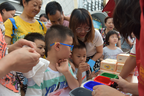 四川新闻网乐山7月4日讯(蒲晓君 文/图)“怀孕了需要去买防辐射服吗?”“正常使用手机,并不会产生有害辐射。”“二手烟对宝宝有危害,记得回去提醒家人哦!”7月3日晚上六点,来自乐山市生态环境局的近20余名党员干部们组成的志愿服务队来到乐山万达广场,开展“绿色乐山·党员服务环保行”活动,摆起了“环保地摊”,吸引了不少市民和小朋友参与互动。