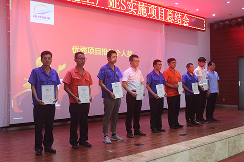 会上,MES项目实施相关负责人、企业代表分别对MES项目实施过程中取得的成果、不足和后期规划进行了总结汇报。表彰了一批在MES项目实施过程中做出突出贡献的个人和团队。其中,中压交联工段获得了MES项目实施 “优秀团队”称号。喻成年、夏建军、张乔等8人获得了MES项目实施“优秀个人推动者”称号。