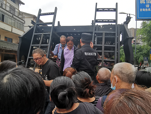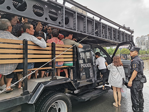 上午8时左右,乐山市公安局特警支队派出了一辆特种攀登车、一辆运兵车,10名警力到现场转移群众。