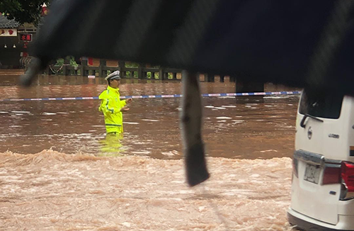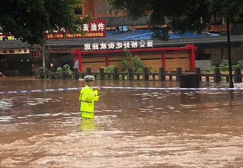 2020年8月18日,乐山遭遇特大洪灾,在市中区张公桥路口,洪水已齐腰。乐山公安交警在洪水中坚守警戒,全力护航人民群众安全。