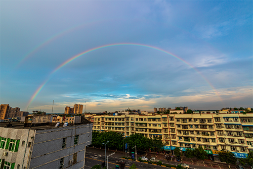 8月19日傍晚,一道彩虹挂在夹江天边。风雨过后,重见的不仅是彩虹,还有更美的夹江。(夹江县委宣传部)