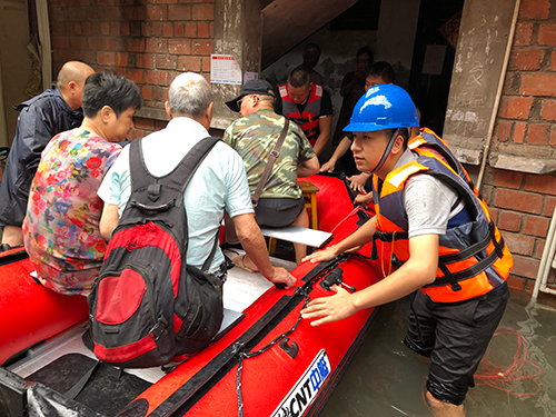 汛情发生后,乐山市生态环境局成立4个抢险救援组,携带冲锋舟,分赴皮革大院、市委宿舍、梅花城等,救助转移受困群众、运送救急物资,累计救助群众500余人次。