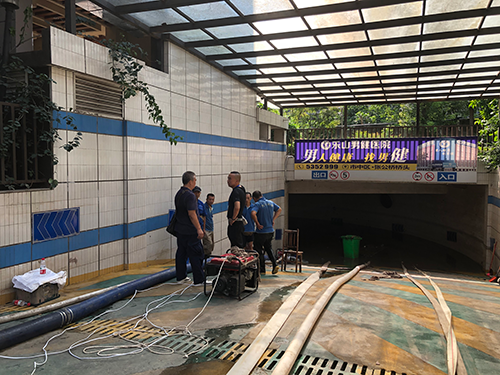 8月19日上午10点,物业协会开始了在翡翠国际、海棠圣景等各大受灾小区的排涝抢险工作。“刚开始我们是行业展开自救,灾情不等人。后来很快住保局等相关部门开始响应,在他们的协调配合下,我们的救援力量更强大了。”乐山市物业管理协秘书长李军说道,“海棠圣景内涝很严重,地下车库的积水大约在五万方以上,几乎与外面的路面齐平。因此我们租来了一台30个千瓦的发电机,可以带动多条水管同时排水。现在,我们正在和内江市派来的抢险救援队协同作战,希望可以尽快完成排涝。”