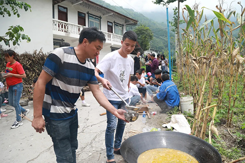 在受灾严重的共安彝族乡林丰村临时避险安置点,记者看到这里已经搭建好了不少帐篷,被转移群众目前衣食丰足,大家或聊天、或散步,像家一样温暖。中午12点,工作人员把热腾腾的午饭端上来,村民们有序排队打饭,锅里是极具当地特色的土豆烧鸡。由于条件限制,村民们只能围成圈、蹲坐在地上吃,但村民们个个吃得都很珍惜。