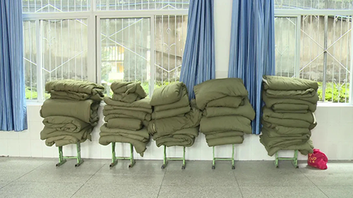 在金河镇初级中学安置点,记者看到,教室成为受灾群众临时的家,在这里,除了床、棉被之外,方便面、矿泉水等生活物资也是应有尽有。
