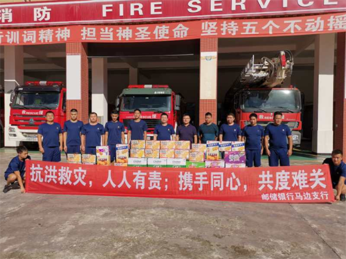 四川新闻网消息(张奕岚)8月18日,乐山市遭遇巨大洪灾,广大消防人员奋战在抢险救灾的第一线,为保障人民群众的安全作出了重大贡献。抗洪抢险任务结束后,中国邮政储蓄银行乐山市分行马边县支行行长谢舜山带领部分干部员工第一时间来到马边彝自治县消防救援大队,看望慰问从抗洪一线胜利归来的消防人员,并送上了慰问品。