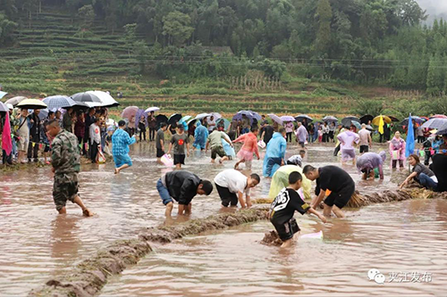 稻田捉鱼比赛在持续一个多小时后落下帷幕,所捉的鱼将赠送给参赛选手。