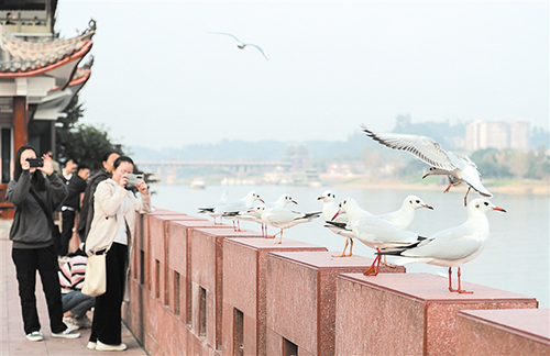 乐山市爱鸟协会提醒市民,红嘴鸥属杂食性鸟类,可以自己捕食鱼虾等食物,不必喂食,希望大家文明观鸟。乐山日报 龚启文