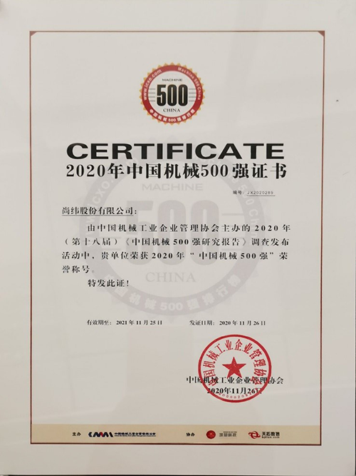 四川新闻网消息(蒲晓君)11月27日,由中国机械工业企业管理协会主办的2020年(第十八届)《中国机械500强研究报告》调查发布活动在北京举行,会议上公布了中国机械500强企业名单,尚纬股份有限公司再次上榜,获颁荣誉证书。