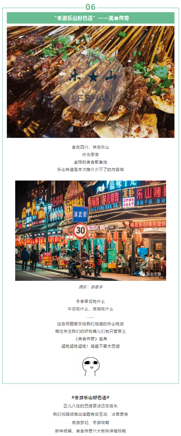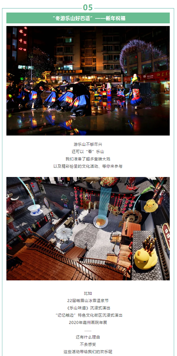 为贯彻落实党的十九届五中全会和省委十一届八次全会精神,进一步激活2020年乐山冬季旅游市场,拉动区域文旅消费,促进疫情常态化条件下乐山文旅行业复苏振兴,即日起,冬游乐山好巴适系列推荐上线啦!本次推荐有话题互动、冰雪奇缘、夜游梦幻、冬游攻略、新年祝福、美食传奇六大篇章,接下来我们将以系列板块形式一一呈现。