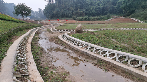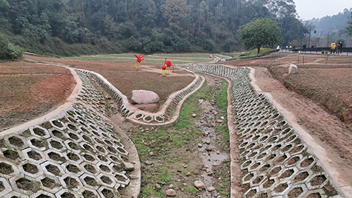 其中,生态水系工程主要包括本次乐山绿心水土保持科技示范点打造范围内现有土质渠道改为生态景观渠。本次整治生态景观渠道长594米,生态景观渠道两侧边墙采用六棱砖铺设,总计铺装六棱空心砖2381平方米,渠底培植花叶美人蕉,空心六棱砖内栽种植物。