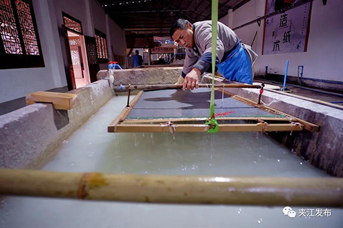在造纸坊,只见工人两手握住竹帘,放进浸泡纸纤维的缸槽,来回晃动后,一层纤维就上了帘。“一张纸从取料到制成,要历时大半年。”石利平说,夹江手工造纸保留了“蔡侯”造纸技术,按照古时的72道工序制作,纸有韧性,洁白细腻。