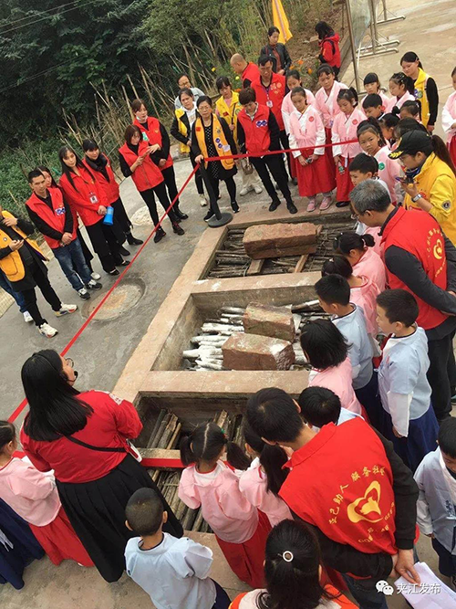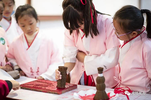 大千纸故里研学基地,学生们着汉服祭拜蔡伦