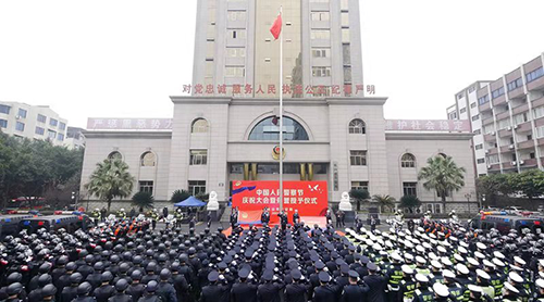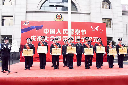 上午11时,副市长、市公安局党委书记、局长邓华,市局党委班子全体成员,市局各部门负责人,全市公安机关受到高等级表彰奖励的集体和个人代表,近期退休民警代表等200余名人精神振奋、斗志昂扬、英姿飒爽,在市公安局机关大楼前整齐列队。