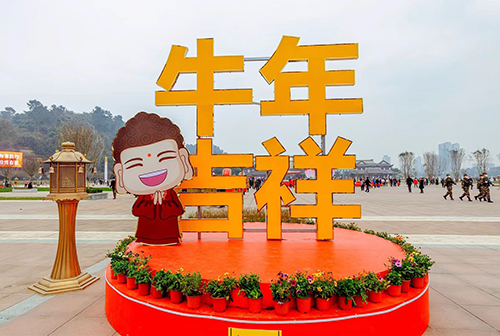 在乐山大佛文化广场,全新打造的雕塑小品、音乐喷泉、迎宾水景等景观,成为备受游客追捧的“宠儿”。景区还在广场周边布置了“牛气冲天”“牛转乾坤”等各种新年卡通灯饰,充满浓浓年味,吸引众多游客拍照留念。