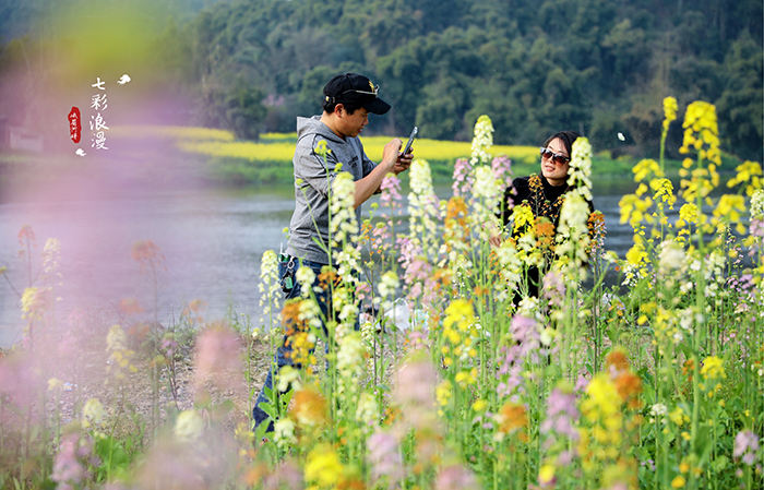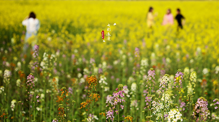 走近花田,淡淡的油菜花香扑鼻而来。桃红、橘黄、嫩白、深橙、淡黄……色彩缤纷的油菜花迎风绽放,吸引蝶舞蜂飞的同时,也引来众多市民游客踏春观赏,拍照留念。