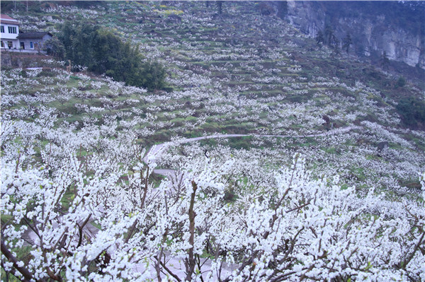 从山下绵延至山上,起伏的山坡上均是李子树。放眼望去,漫山遍野开满了洁白的李花,一幢幢漂亮别致的民居散布其间,纵横交错的产业路通达园区,李花丛中蜂鸣蝶舞,乡野自然风光直扑眼前。