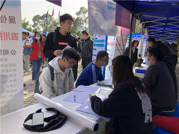四川新闻网消息(蒲晓君)“请问工作地点在哪里?招几个人呢?”“我们公司设计岗位招3个人,同学有兴趣也可以扫二维码了解具体情况。”3月27日,成都理工大学工程技术学院与四川省职业介绍服务中心联合举办的“2021年大中城市联合招聘四川高校毕业生春季专场招聘会暨成都理工大学工程技术学院2021届毕业生就业双选会”在该校585广场举行。此次双选会,吸引了226家优质企业、单位携11039个岗位来校揽收人才。