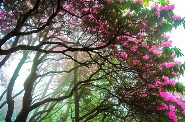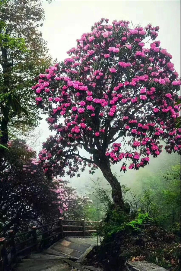 峨眉山以其“一山有四季,十里不同天”的独特气候,每年4月中旬至6月,从海拔500米的报国寺到海拔3099米的万佛顶,各类杜鹃次第开放,姹紫嫣红、千姿百态,倍受中外游人喜爱。