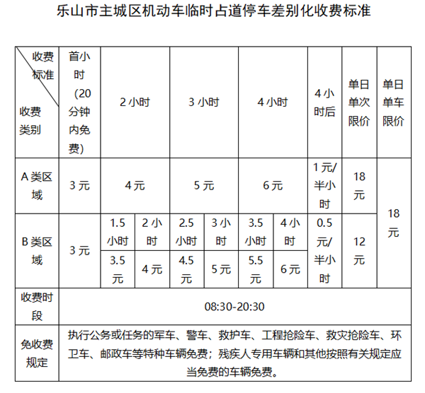 A类区域占道停车收费标准为:首小时内3元/辆·次,2-4小时为每小时1元(不足1小时按1小时计),以后每半小时1元(不足半小时按半小时计);单日单次最高收费不超过18元。B类区域占道停车收费标准为:首小时内3元/辆·次(不足1小时按1小时计),以后每半小时0.5元(不足半小时按半小时计);单日单次最高收费不超过12元。A、B区域范围内交叉停车单日单车最高收费不超过18元。