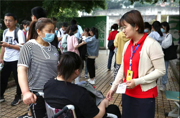 四川新闻网消息 6月7日上午,一辆由考生家长开着的小轿车破例驶入了乐山一中考点。随后,从车上下来了一名女孩,手臂上还残留着些许红点。女孩父亲用轮椅推着她,在两名学生志愿者的陪同下,一起前往考场。