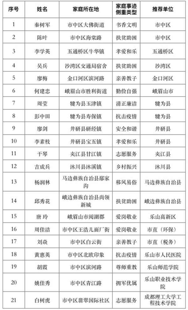 四川新闻网消息(记者 李举涛)记者6月18日从乐山市妇联获悉,乐山拟对按流程推荐的21个2021年乐山市最美家庭进行表扬,现正在公示中。