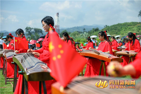 “唱支山歌给党听”……随着铿锵有力的旋律响起,由百人古筝组成的心形演奏团激情演绎,现场上百名爱心人士、当地群众共同舞动红旗齐声高歌,唱响对祖国炙热的爱,传递对党赤诚的心。