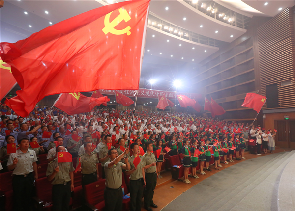 四川新闻网消息(李薪)筚路蓝缕创伟业,初心不忘再起航。6月28日晚,乐山大佛剧院歌声嘹亮,灯光璀璨,以“永远跟党走”为主题的乐山市庆祝中国共产党成立100周年文艺演出活动在此隆重举行。