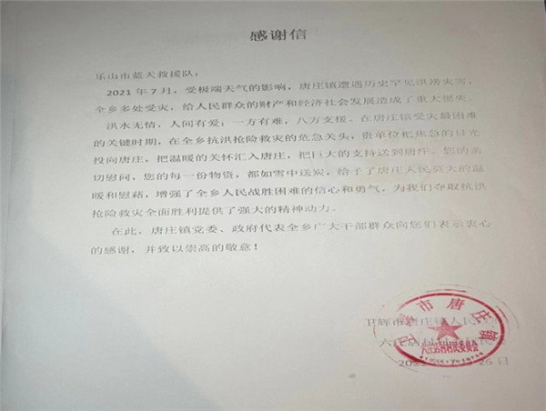 杨智浩所在的蓝天救援队还收到了来自卫辉市唐庄镇人民政府的感谢信,11名救援队员的事迹获得当地人民的一致肯定和称赞。