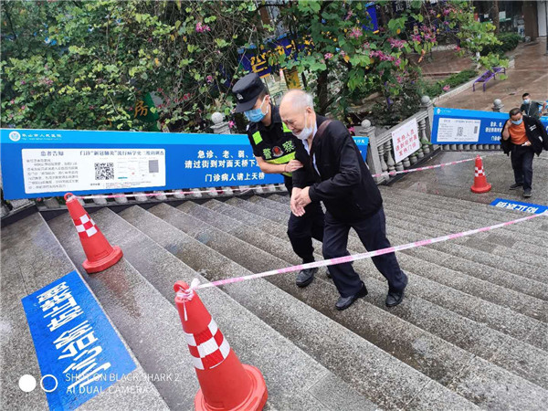 杨智浩在医院扶老年患者上楼梯(受访者供图)
