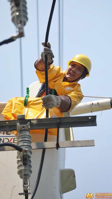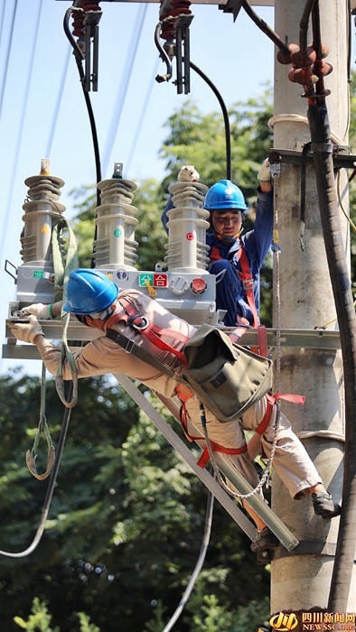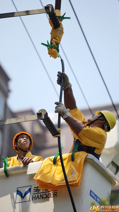 8月3日正午1点,乐山市沙湾区铜河路北段,室外温度超过45摄氏度,乐山电力工人头顶烈日,登杆作业,抢险保电,厚厚的衣服已被汗水浸透。